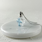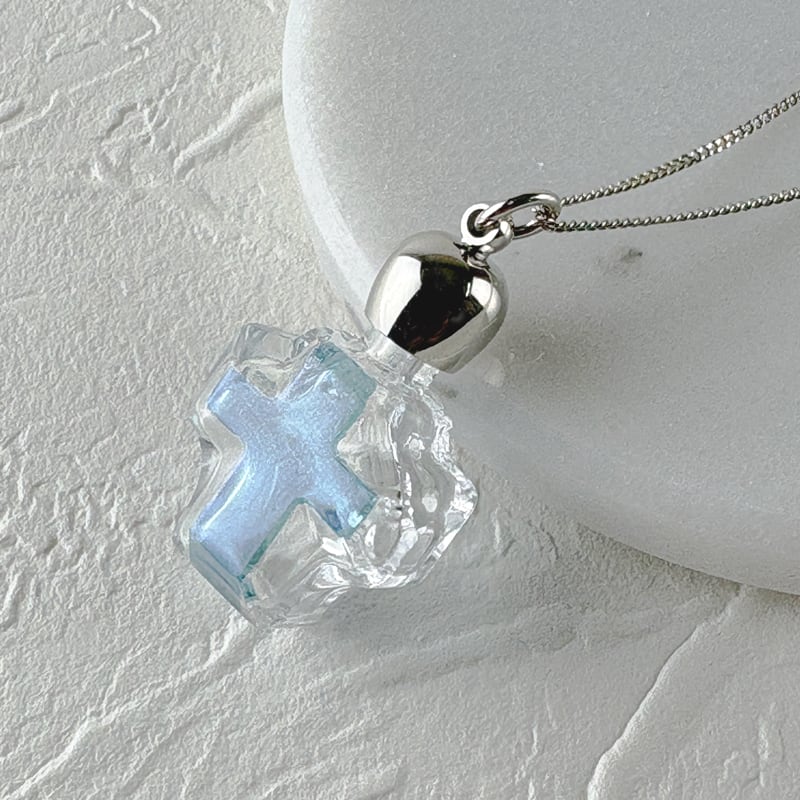 クロス型のガラスのボトルに、片面のみ十字架のブルーのプリントを施しました。十字架デザインを楽しみたい場合は表にブルーを、ガラスの透け感を楽しみたい場合は裏面をブルーにしてお使いください。その日のコーディネートに合わせられるリバーシブルが便利です。