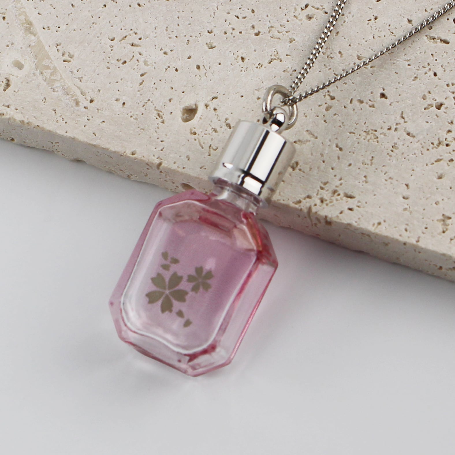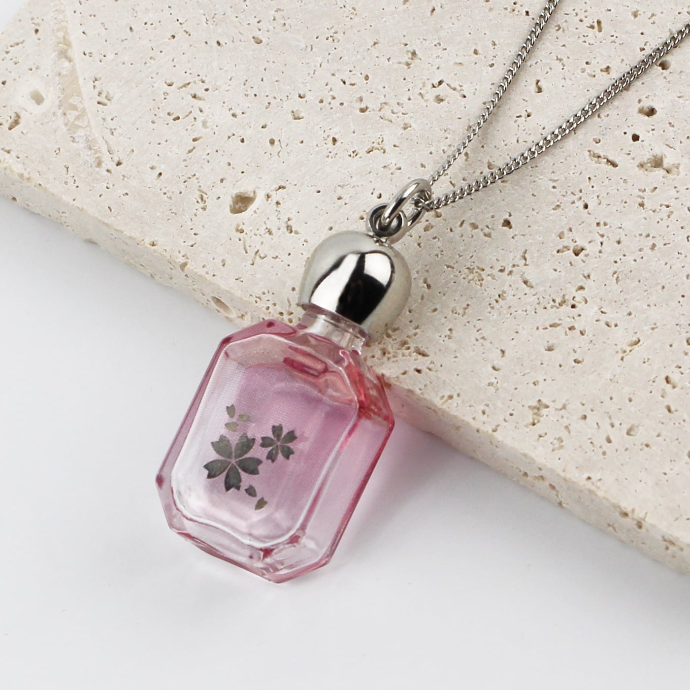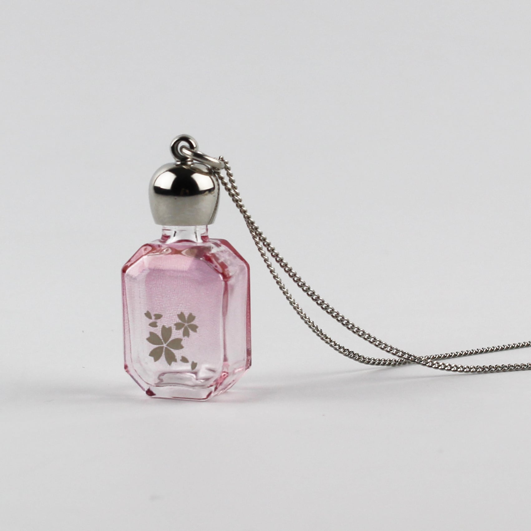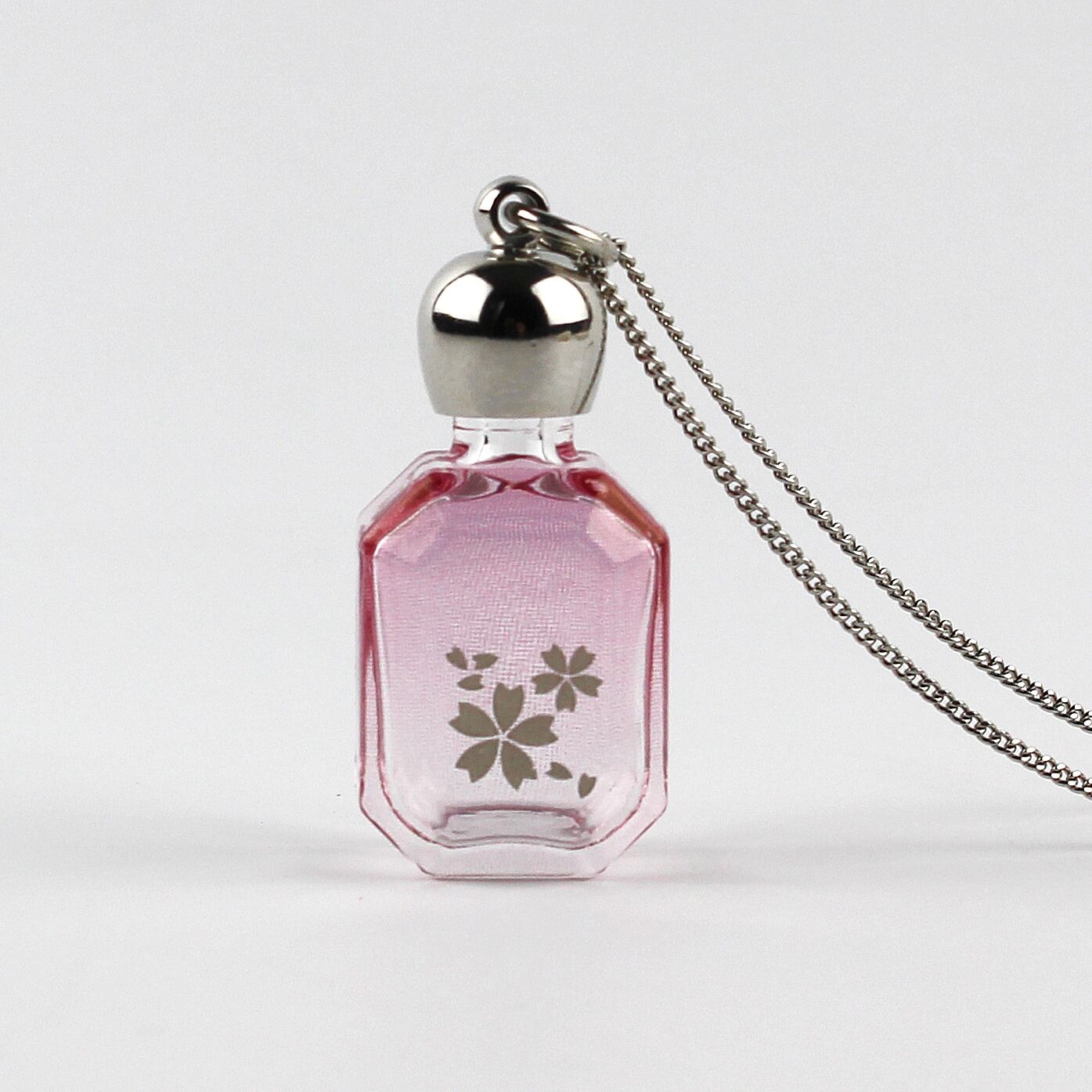 エメラルド型のガラスのボトルに、プラチナ色のさくらとピンクのグラデーションのプリントを施しました。ガラスの透明感と美しい淡いピンクが大人の雰囲気たっぷり、高級感のあるペンダントです。