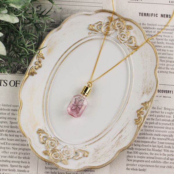 エメラルド型のガラスのボトルに、表面は金の線でプルメリアを1輪、裏面はピンク色のグラデーションのプリントを施しました。ガラスの透明感と美しい淡いピンクが大人の雰囲気たっぷり、高級感のあるペンダントです。