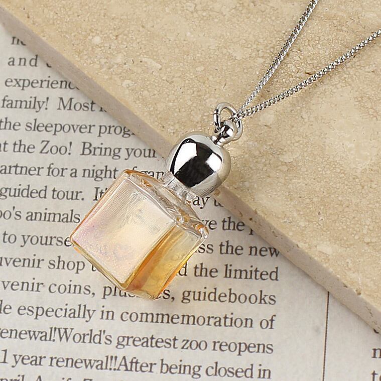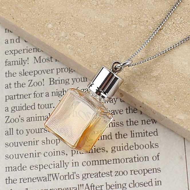 キューブ型のガラスのボトルに、琥珀に近いイエローグラデーションのプリントを施しました。上に向かって淡いイエローになるグラデーションのみのデザインです。シンプルで使いやすいアロマペンダントに仕上がりました。