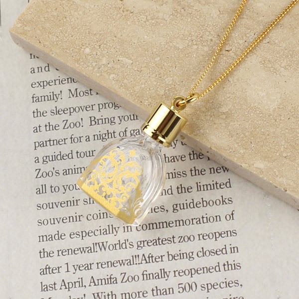 チャペル型のガラスのボトルに、マットゴールドのアラベスクデザインのプリントを施しました。落ち着いた大人の雰囲気たっぷり、高級感のあるペンダントです。