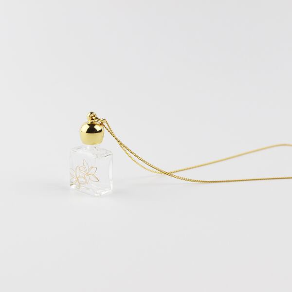 平角型のガラスのボトルに、表面に本金を使用した金の線でプルメリアを2輪プリントを施しました。ガラスの透明感とキラリと光る金色のプルメリアが高級感のあるペンダントです。